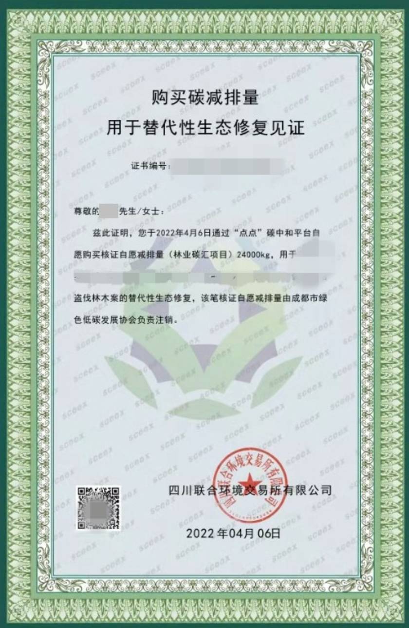 2022年,雅安市宝兴县法院审理了一起盗伐林木案。6名被告人因盗伐林木罪在分别被判处六个月到三年六个月不等的拘役、有期徒刑和单处或并处罚金外,被要求补种70棵云杉树。但除此之外,6位被告人还另外自愿花了一笔钱从四川联合环境交易所认购了24000千克“碳汇”。