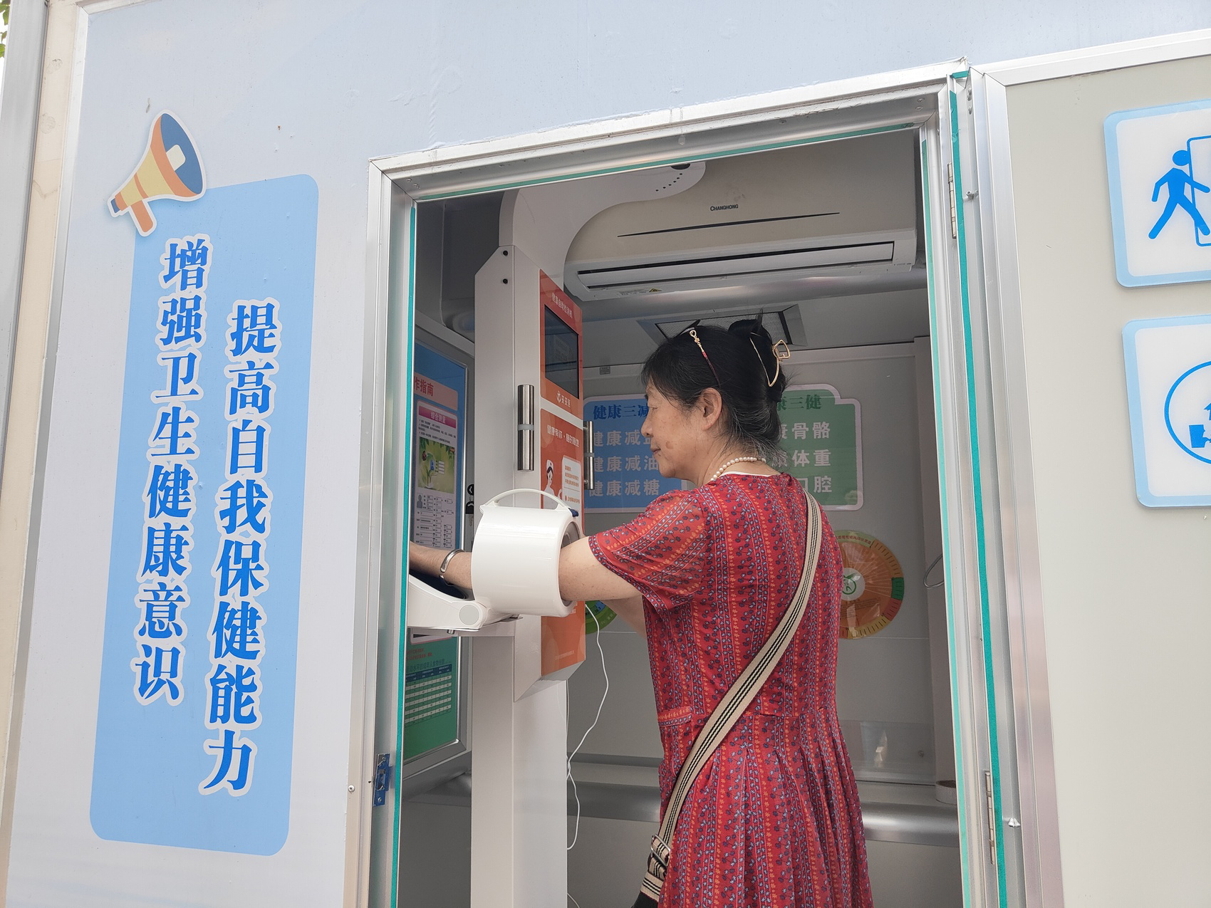 市民在使用健康便民服务驿站内的设备自主检测。唐显枚 摄