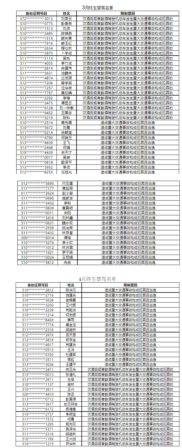 6月6日,记者从四川省公安厅交警总队获悉,近日,该总队向社会公布了2023年3月、4月共计81人的终生禁驾名单。从年龄上看,在这81人名单中年龄最小的18岁,年龄最大的66岁。据名单显示,这批被终生禁驾人员年龄在30岁至55岁之间的共有58人,约占本次被终生禁驾人员的72%。从被终生禁驾原因看,饮酒后或者醉酒驾驶机动车发生重大交通事故构成犯罪的37人,约占总人数的46%;造成交通事故构成犯罪且逃逸的44人,约占总人数的54%。