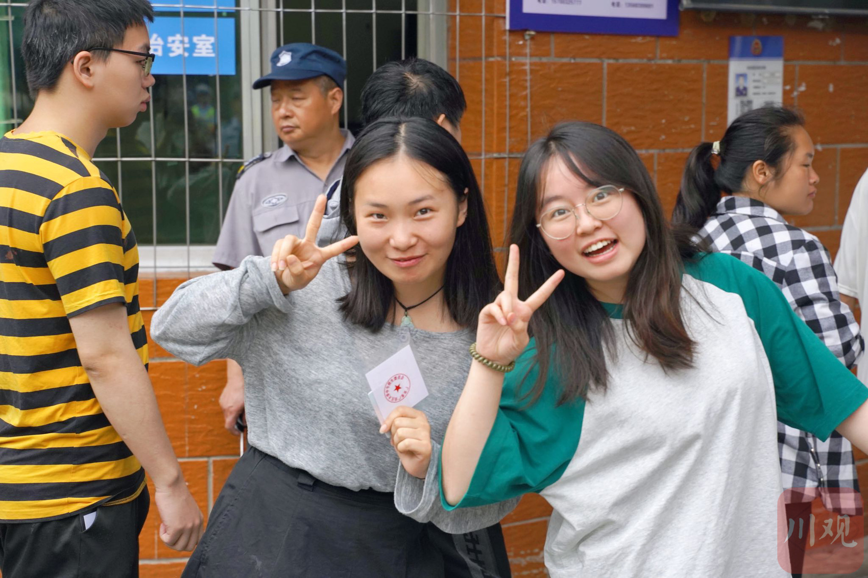 广安友谊中学高考考点,两位即将入场的考生俏皮地面向镜头摆姿势。 吴迪 摄