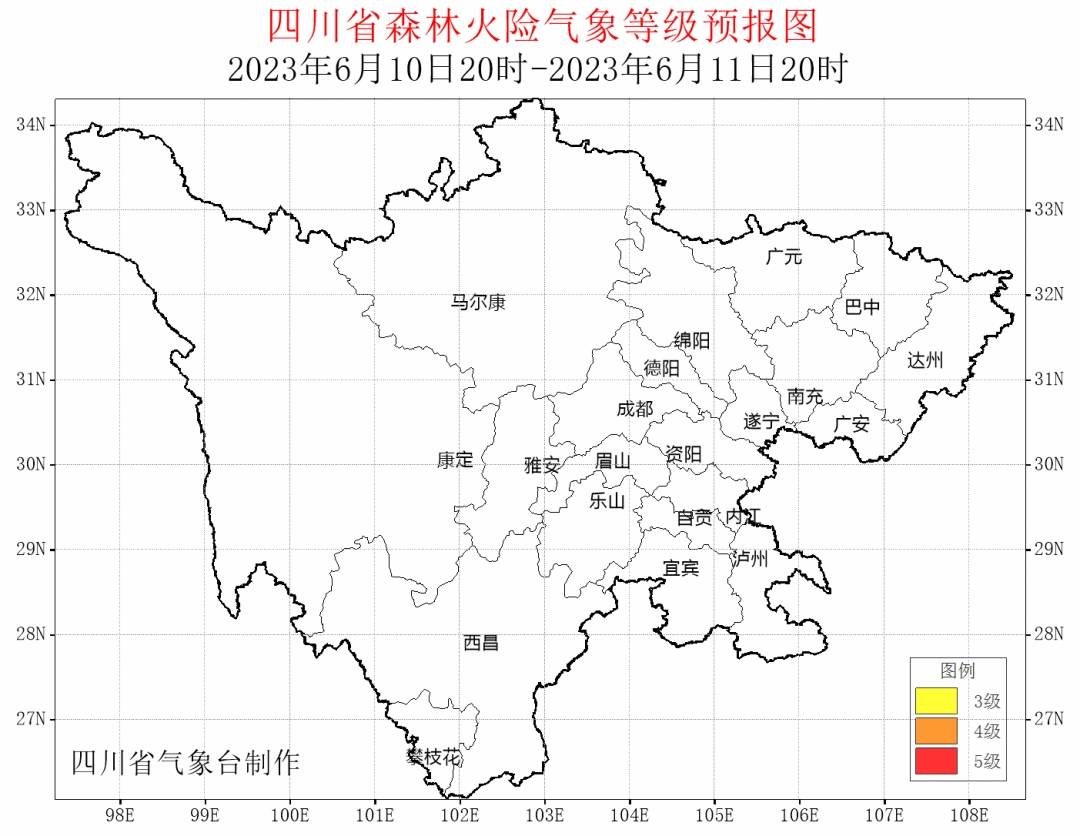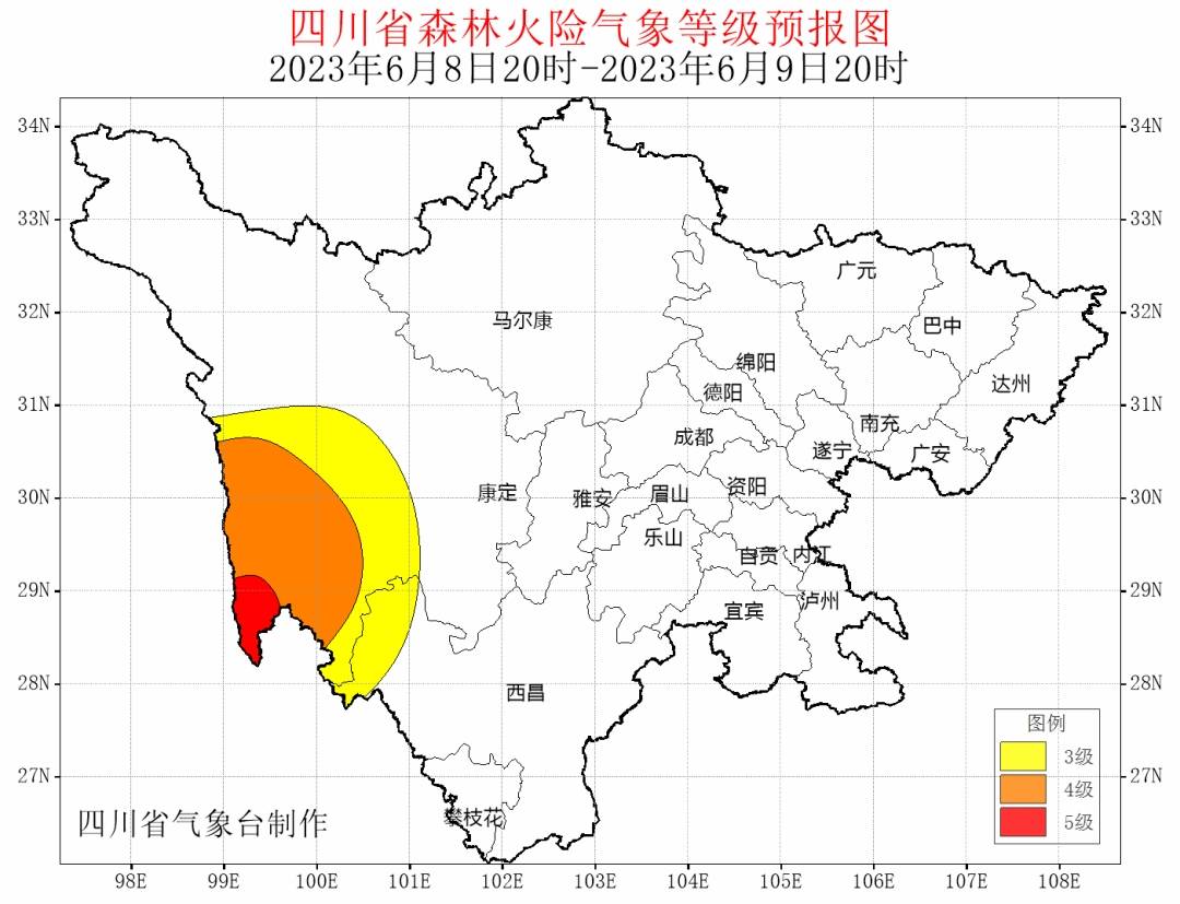 据最新气象资料分析:6月8日20时~11日20时,攀西地区大部地方有阵雨或雷雨,西部南部有中到大雨,局地有暴雨,甘孜州中部、南部有中雨,局部大雨,森林草原火险气象等级将逐渐降低,其中9~10日甘孜州西南部和凉山州西北部森林草原火险气象等级为3~4级,局部为5级。请相关州市加强火源管理,做好森林防火工作。