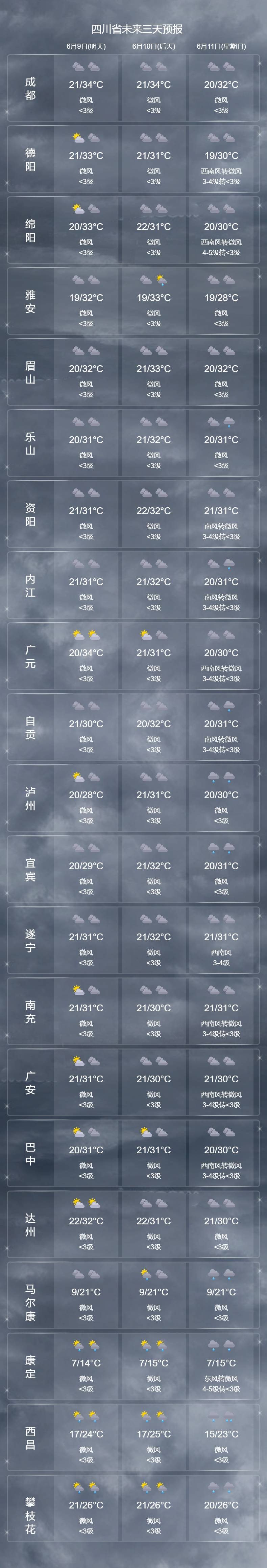 预计10日盆地大部晴,川西高原和攀西地区多云间阴天有分散阵雨,局部中到大雨;11~15日盆地多云间阴天有分散阵雨,局部中雨,川西高原和攀西地区阵雨,部分地方中雨,局部大雨。