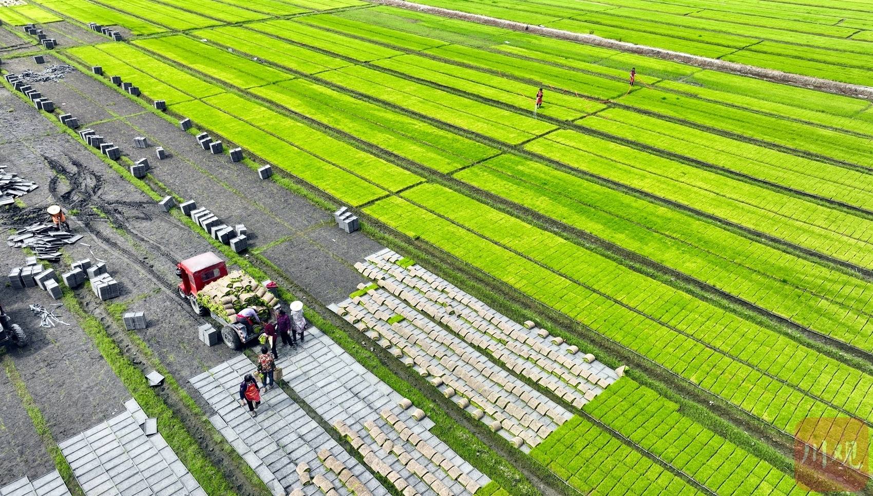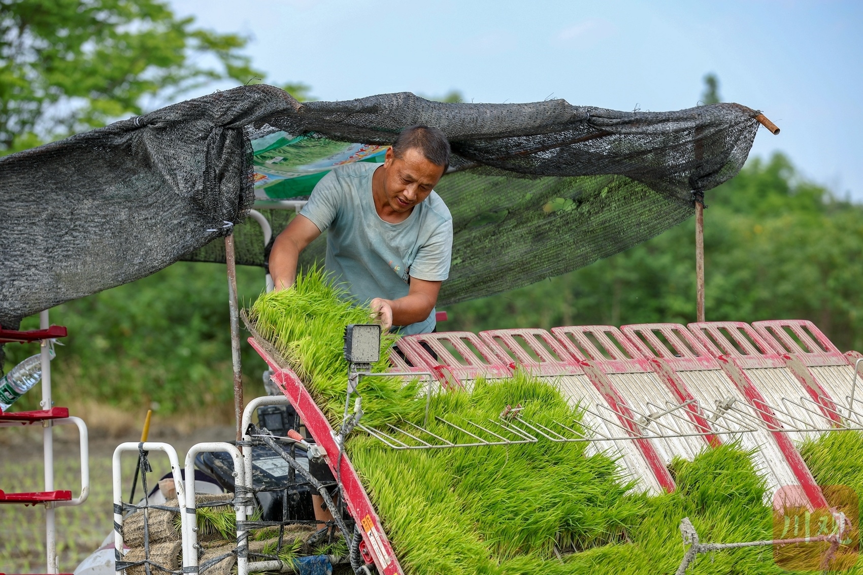 芒种前后,正值插秧农忙时节。6月5日,在成都市青白江区弥牟镇狮子村水田里,村民们忙着取秧苗、插秧,装满绿油油秧苗的水稻插秧机也穿梭田间,有序工作,田间呈现出一派生机盎然的景象。