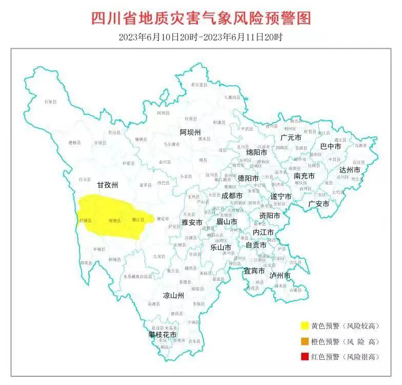 另一方面,四川省地质灾害指挥部办公室发布6月10日20时至6月11日20时全省地质灾害气象风险预警↓↓↓