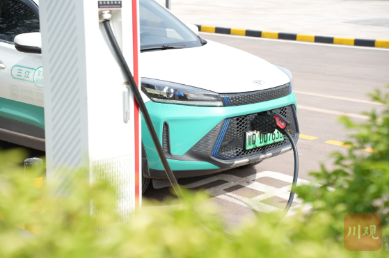 6月10日,在宜宾市长江工业园充换电服务中心,一排新能源汽车整齐停放在充电桩前充电,这是四川首座面向公众开放的全液冷超充站。