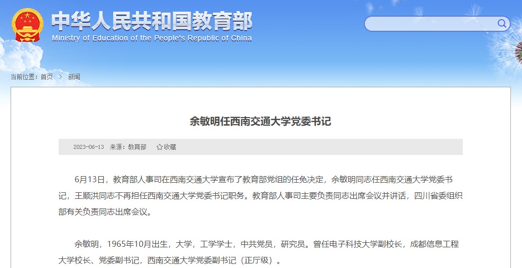 6月13日,教育部人事司在西南交通大学宣布了教育部党组的任免决定,余敏明同志任西南交通大学党委书记,王顺洪同志不再担任西南交通大学党委书记职务。教育部人事司主要负责同志出席会议并讲话,四川省委组织部有关负责同志出席会议。