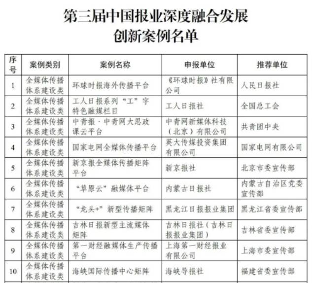 据悉,中国报业深度融合发展创新案例评选范围覆盖党政军民学,是中国报业规格较高的评选奖项。本次共评出获奖案例全媒体传播体系建设类18个,内容供给创新类22个,运营服务模式创新类11个,数字技术应用类4个,管理体制机制创新类5个。60个案例反映了我国报业融合发展向纵深推进取得的新进展新成效,要求各地区各部门要积极宣传推广,组织学习借鉴创新案例经验做法。