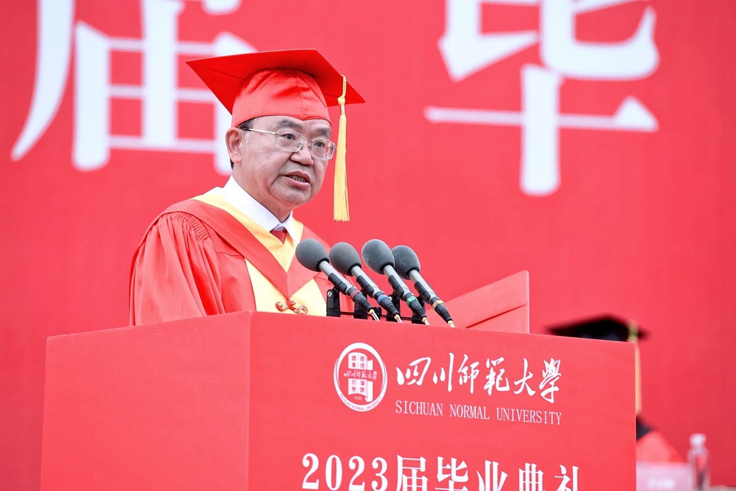 四川师范大学校长汪明义以《志道据德,依仁游艺——构筑人生价值坐标,为民族复兴贡献青春智慧和力量》为主题发表致辞,深情寄语2023届毕业生。
