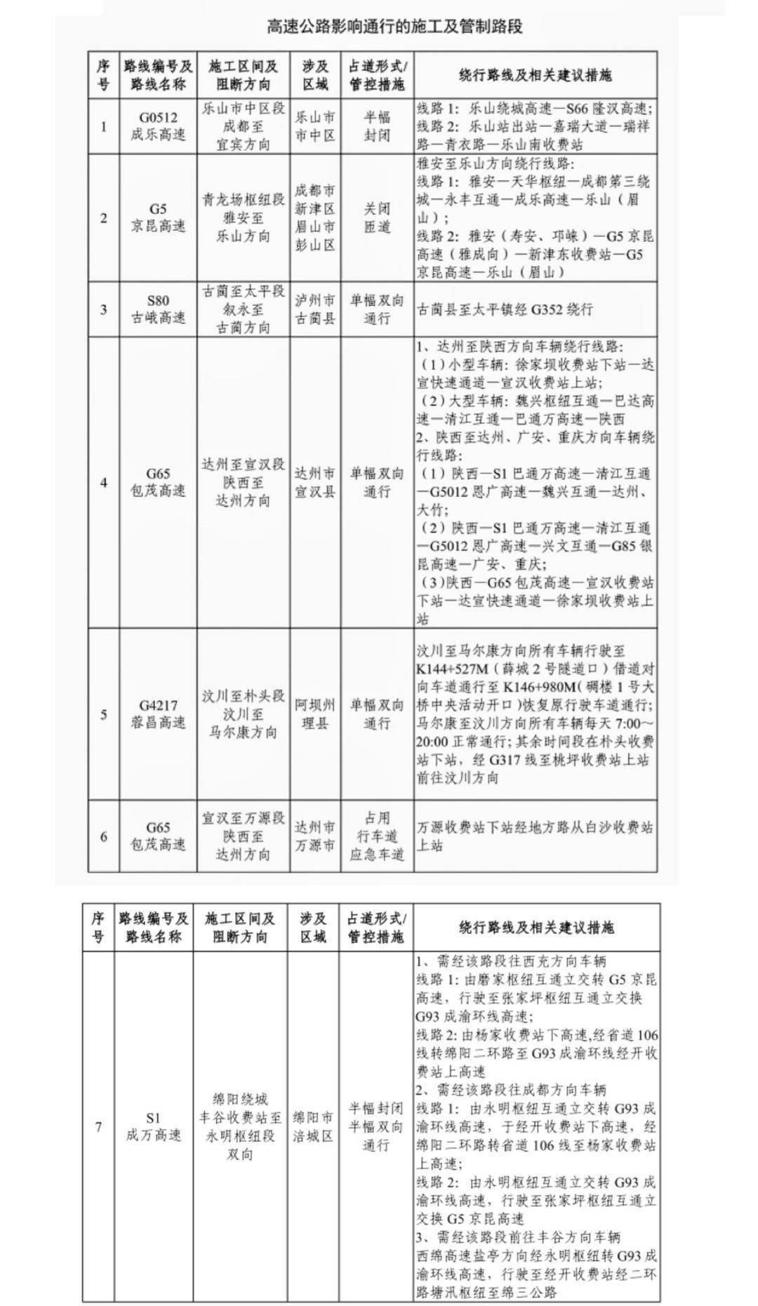 节日期间,全省高速公路禁止危险化学品运输车辆通行,暂停对运输超限超载不可解体物品车辆允许通行高速公路的意见反馈,对除鲜活农产品运输车以外的三轴(含)以上货运车辆,四川公安交警将适时采取科学精准的临时交通管制、错峰通行措施。6月22日至24日,高速公路施工路段原则上停止施工,对辖区正在施工的路段要督促施工单位在节前尽快完工恢复路面,对因特殊情况不能完工的施工路段,严格规范标志标牌及安防设施。