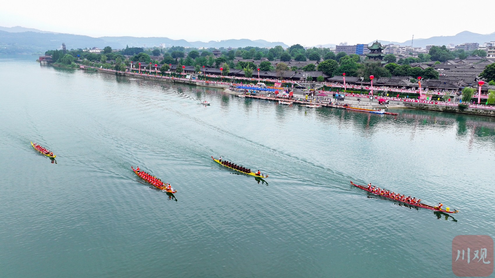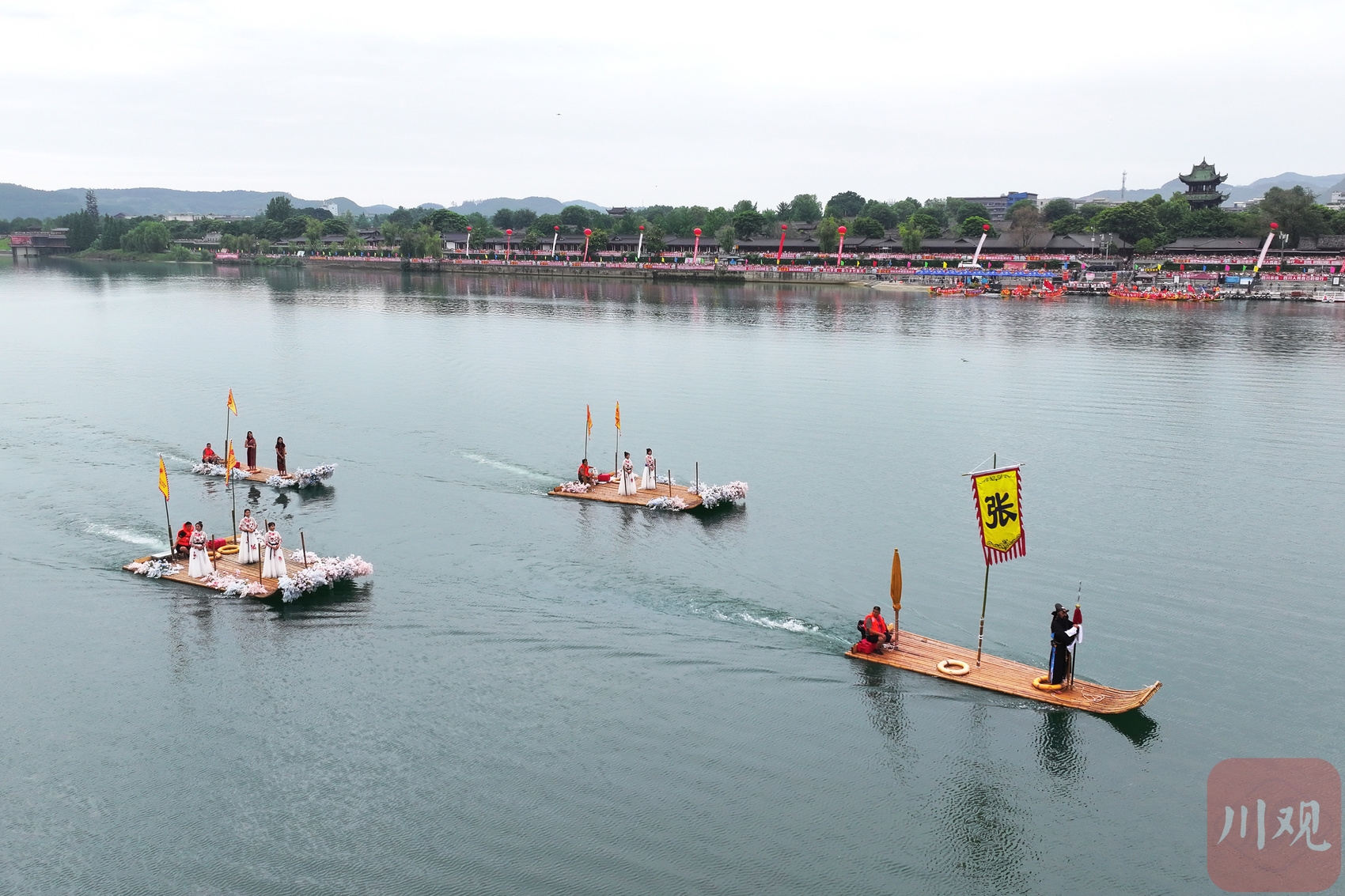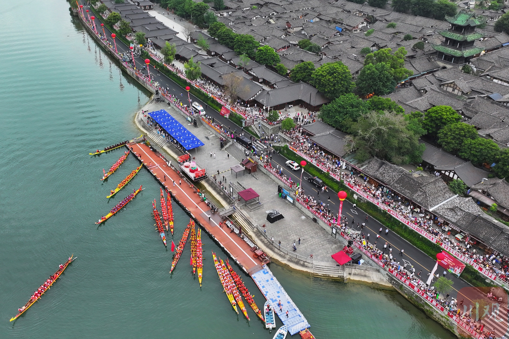 2023年6月21日,四川省阆中古城嘉陵江上龙舟竞渡。16支龙舟队你追我赶,奋楫争先,迎接即将到来的端午节。当地民俗表演“张飞巡江”拉开了活动序幕。紧张的比赛间歇,文艺工作者还乘竹筏踏江而来,演唱了精彩的民歌。