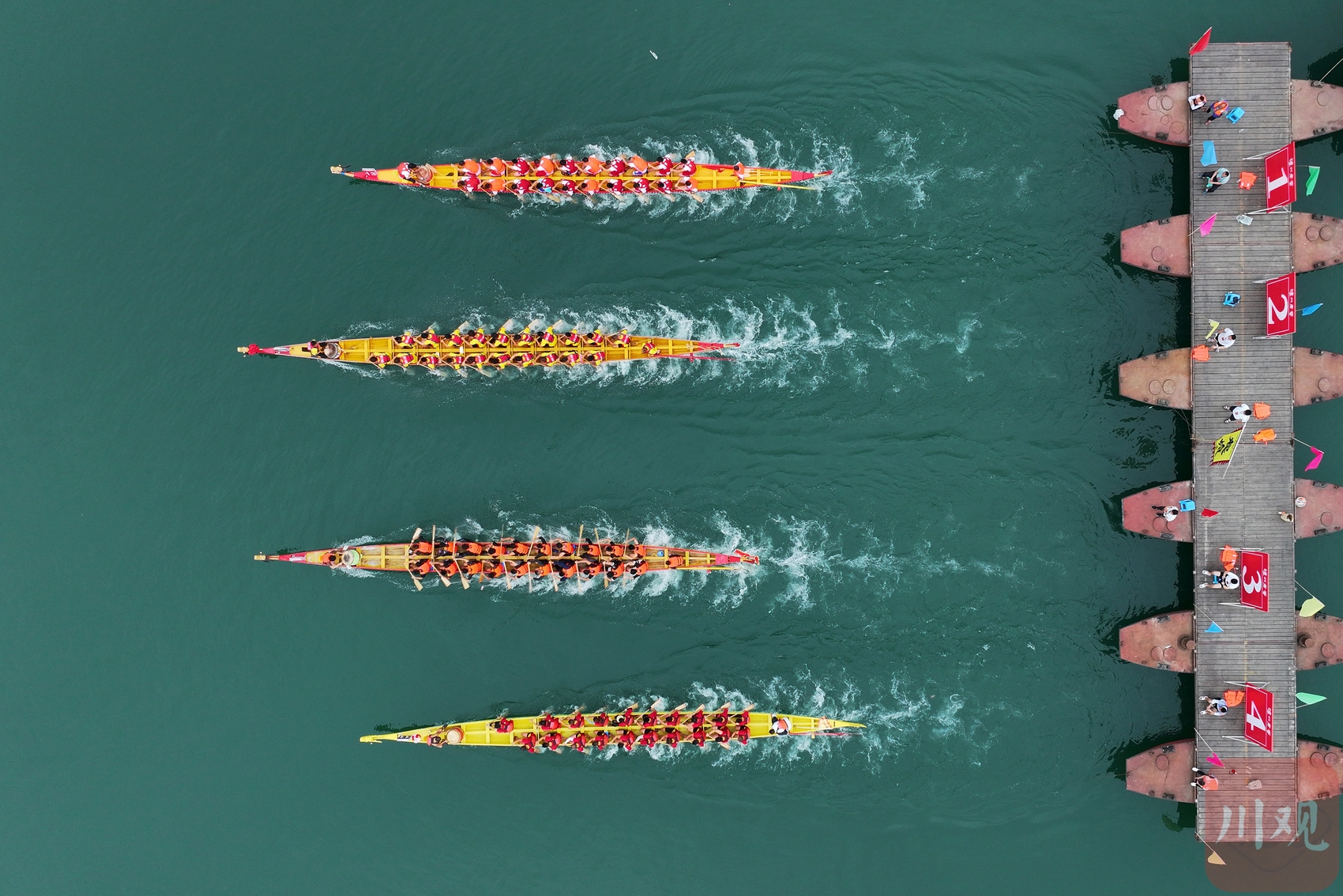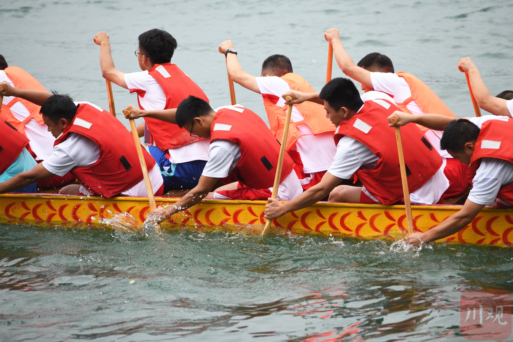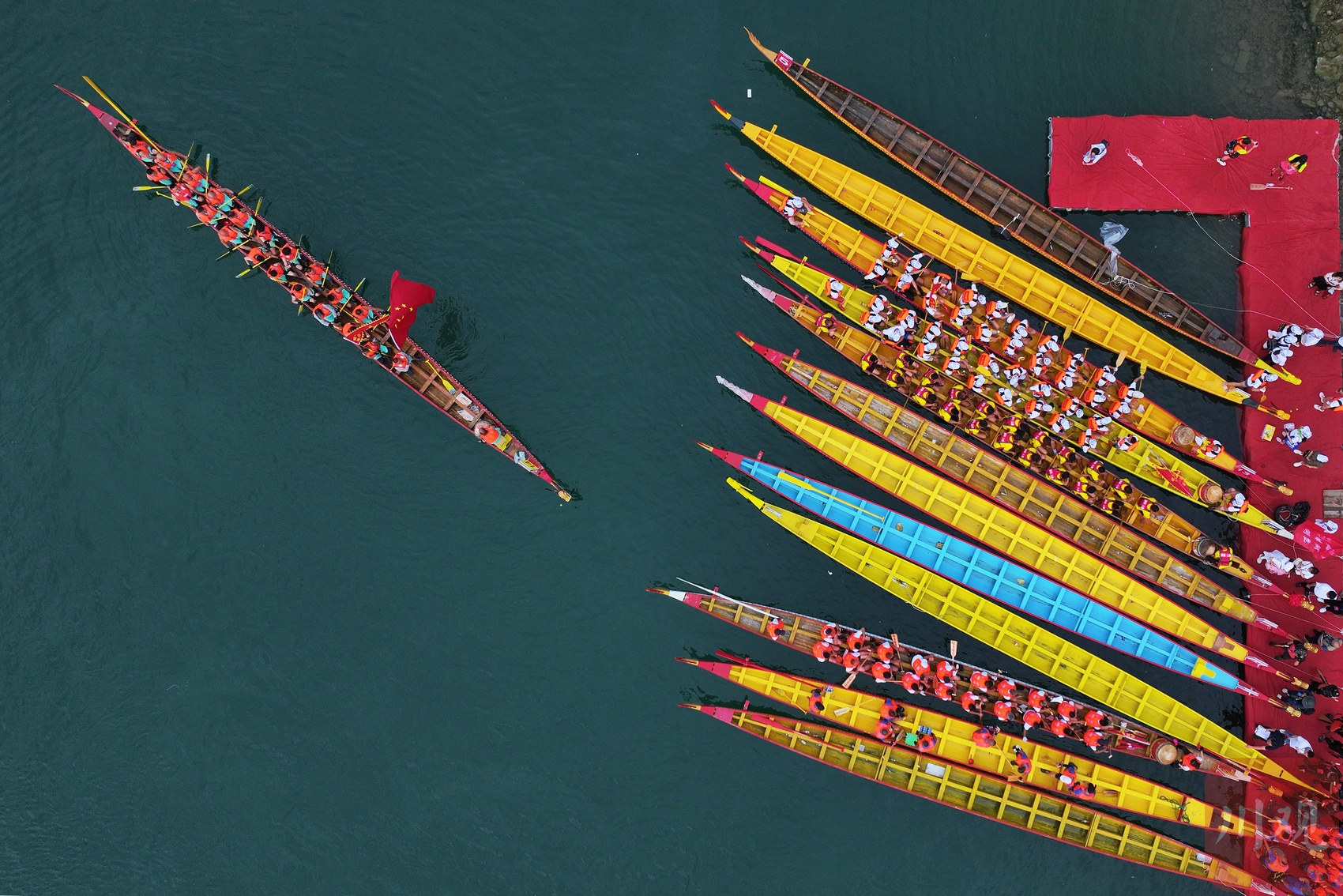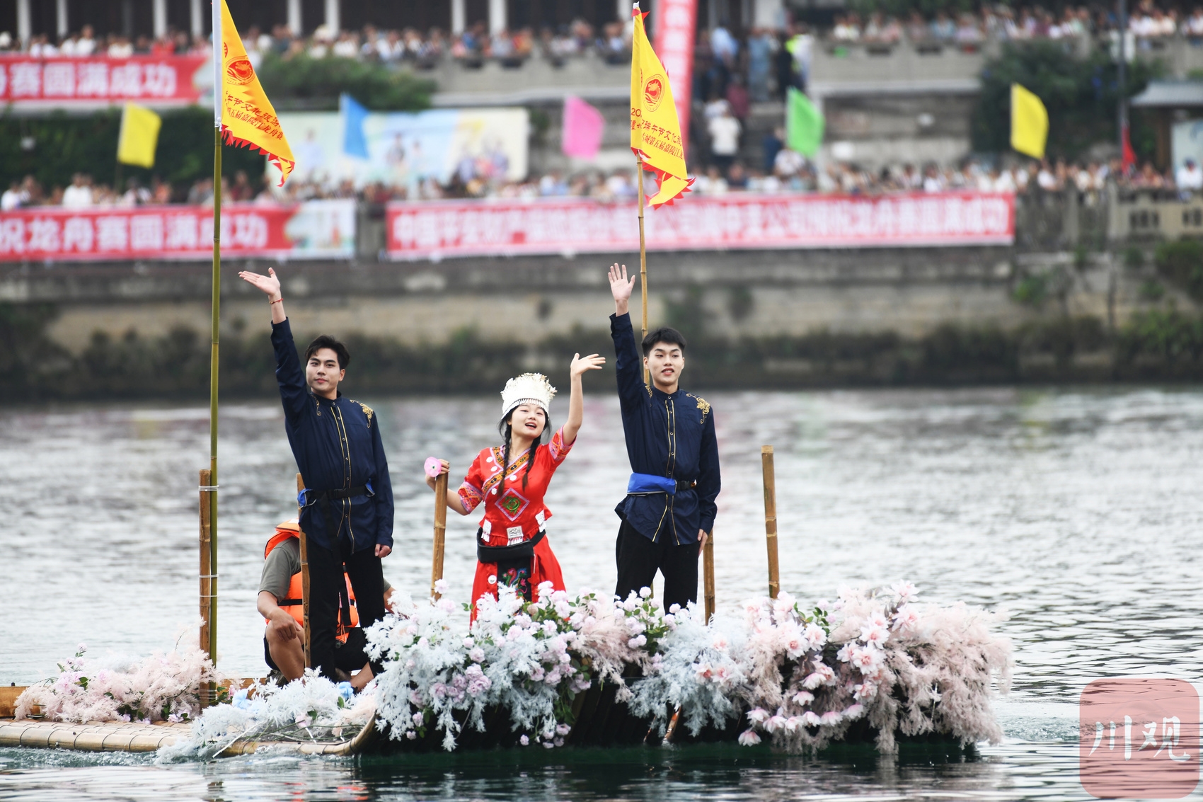 2023年6月21日,四川省阆中古城嘉陵江上龙舟竞渡。16支龙舟队你追我赶,奋楫争先,迎接即将到来的端午节。当地民俗表演“张飞巡江”拉开了活动序幕。紧张的比赛间歇,文艺工作者还乘竹筏踏江而来,演唱了精彩的民歌。