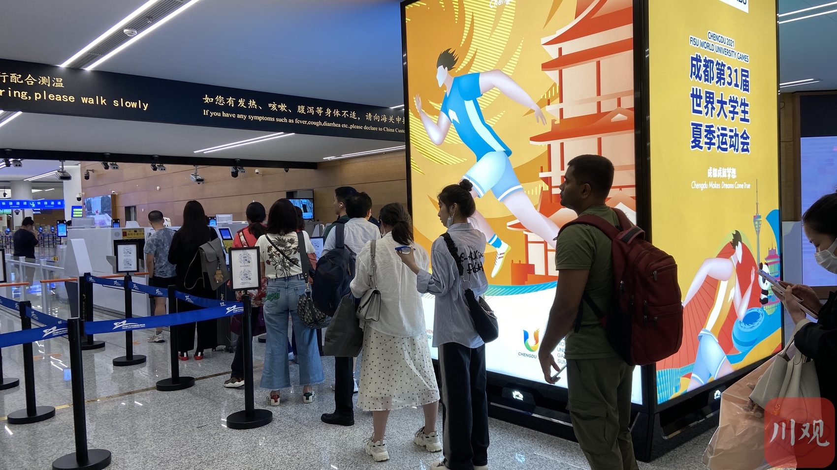 过海关入境,15秒以内完成8项功能检测;撑杆、射击、击剑器械,入境要走专用通道……成都大运会即将来临,国际大体联及各国家、地区代表团参赛人员和物资将从成都等口岸进出境。本届大运会预计涉赛人员近万名,7月中下旬将迎来集中入境高峰。当前,大运会通关保障筹备工作已进入倒计时,机场大运会通关指引牌也已安装就绪。为应对大运会人员集中通关,提升成都天府国际机场通关体验,成都海关又有哪些“智慧”建设?