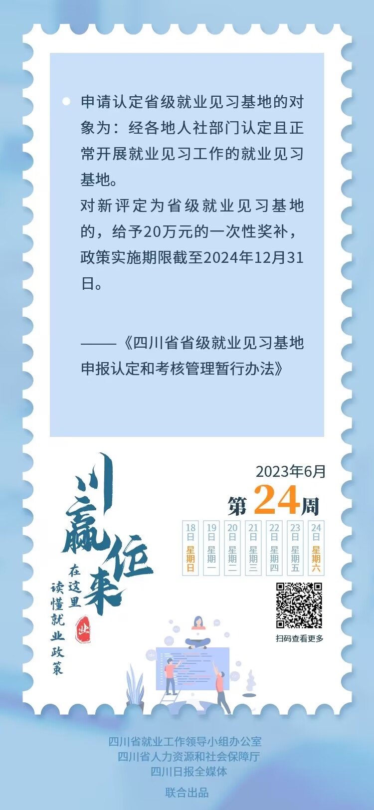 对吸纳符合条件人员参加就业见习的单位,就业见习补贴标准参照当地最低工资标准执行。(就业见习补贴标准实施期限截至2024年12月31日)。对新评定为国家级、省级就业见习基地的,分别给予30万元、20万元一次性奖补。(政策实施期限截至2024年12月31日)。
