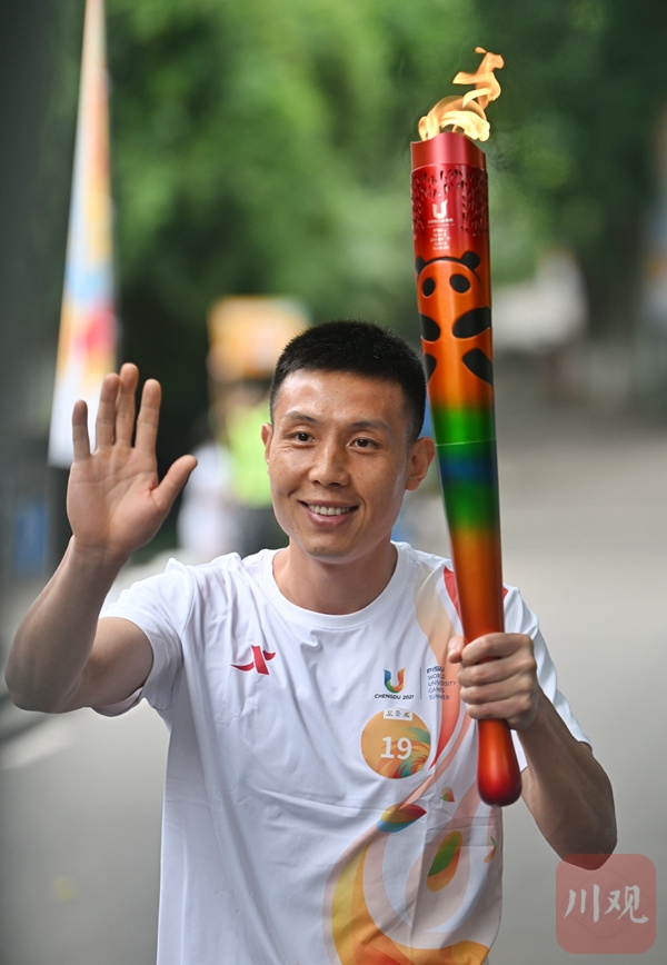 6月24日,成都大运会火炬传递仪式在重庆大学举行,第19棒火炬手是成都市公安局特警支队副支队长李建华。高举火炬稳步前行,李建华在观众们的加油声中顺利完成火炬传递任务。