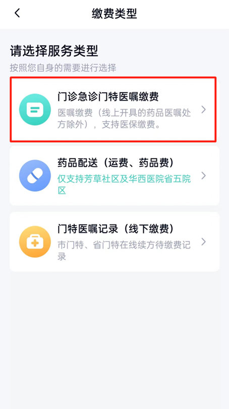(1)医生开具医嘱后,进入“四川大学华西医院”微信公众号,点击“诊疗服务”→“门诊急诊缴费”。或进入“华医通”APP,选择“四川大学华西医院”→“门诊急诊缴费”。