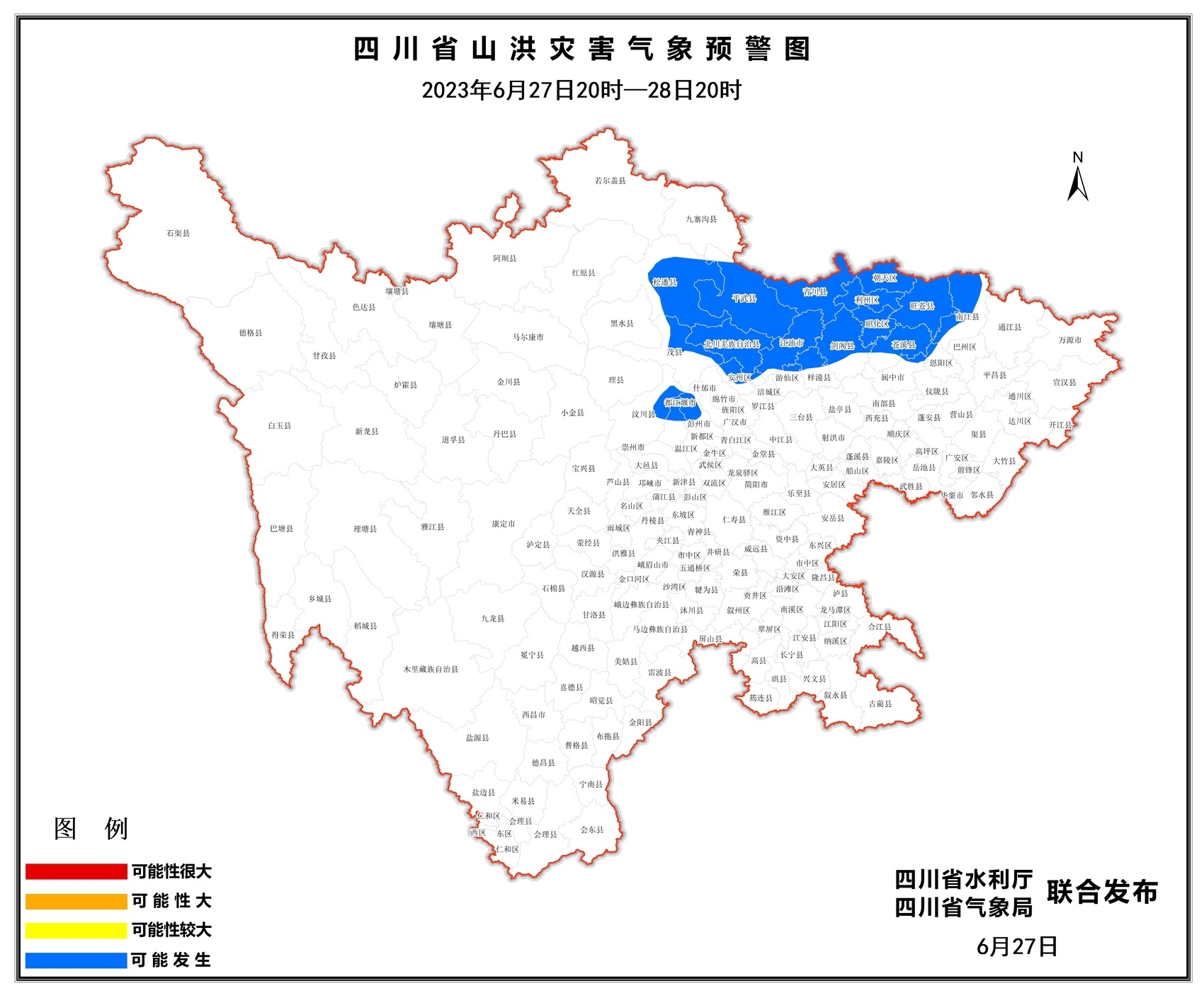 6月27日17时,四川省水利厅、四川省气象局联合发布山洪灾害蓝色预警。