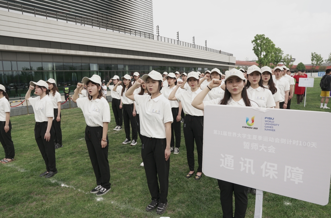 中国电信员工方阵参与大运会倒计时100天誓师大会。