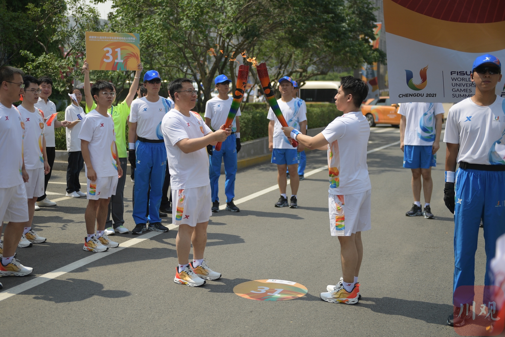 6月28日,成都第31届世界大学生夏季运动会火炬传递宜宾站在宜宾学院校园内举行。火炬手蔡乐才(右前)、郝建鹏在火炬传递中交接。新华社记者 王曦 摄