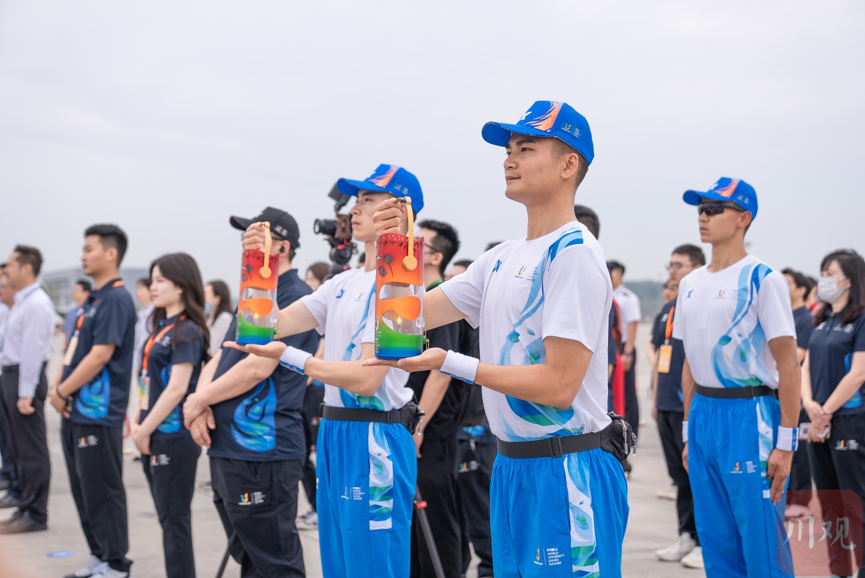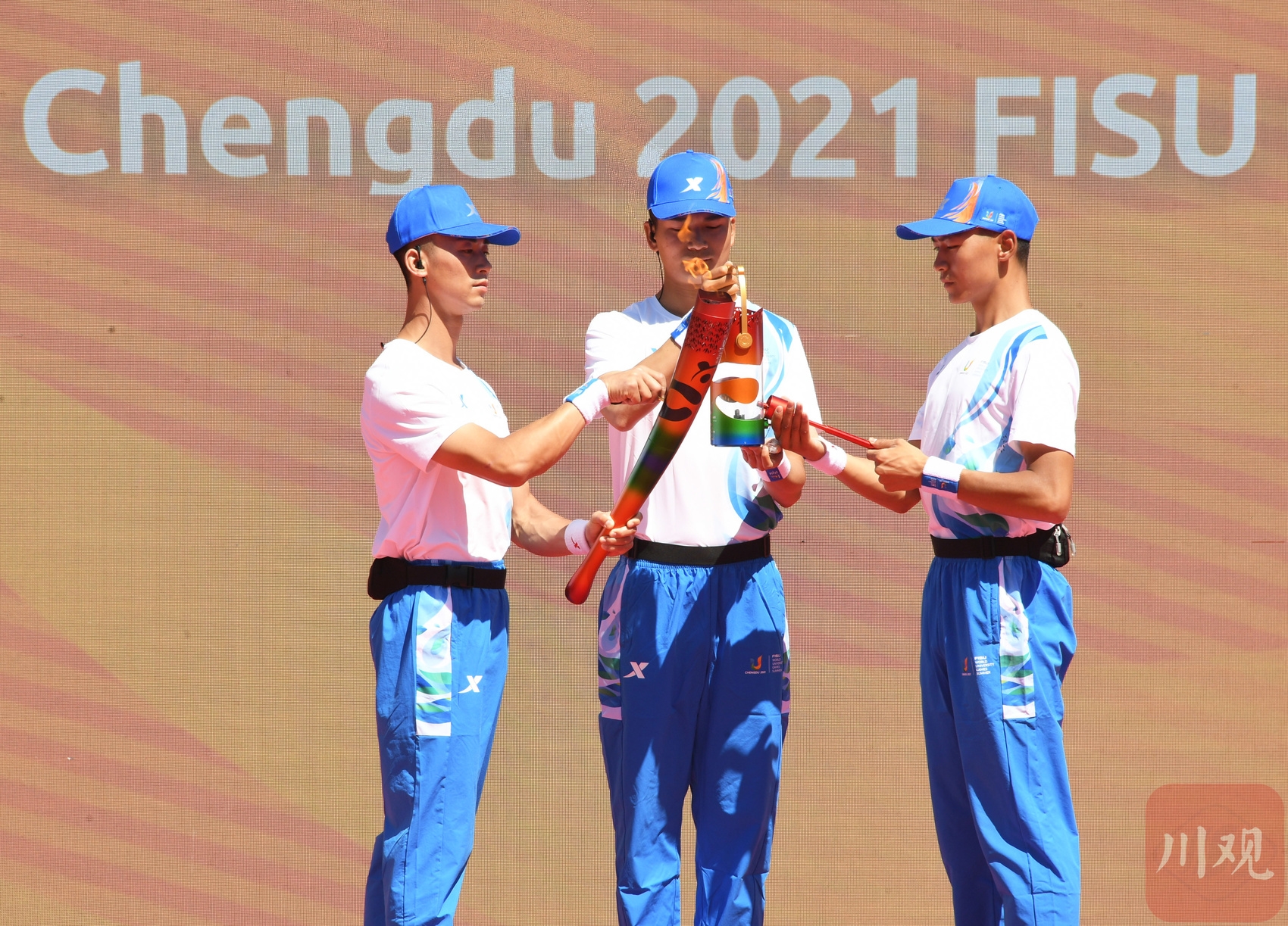6月10日,成都第31届世界大学生夏季运动会火炬传递启动仪式在京举行。6月10日,护卫队队员收火。新华社记者 任超
