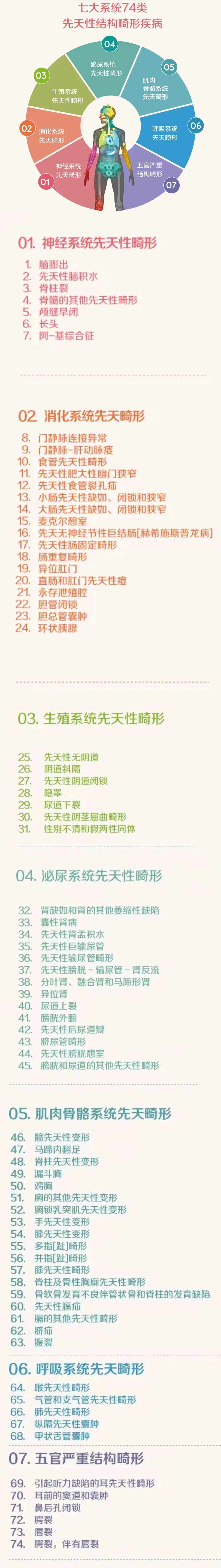 2.先天性结构畸形救助病种包含七大系统74类疾病: