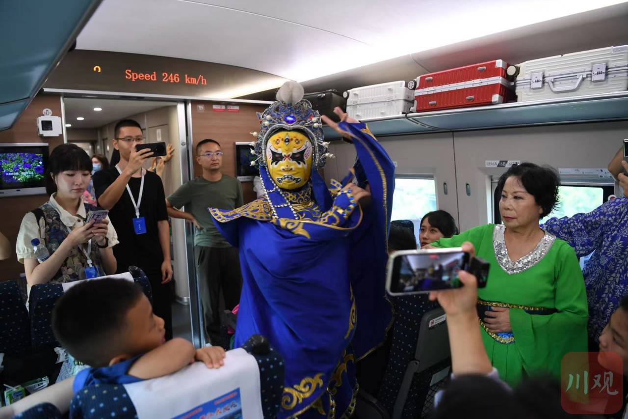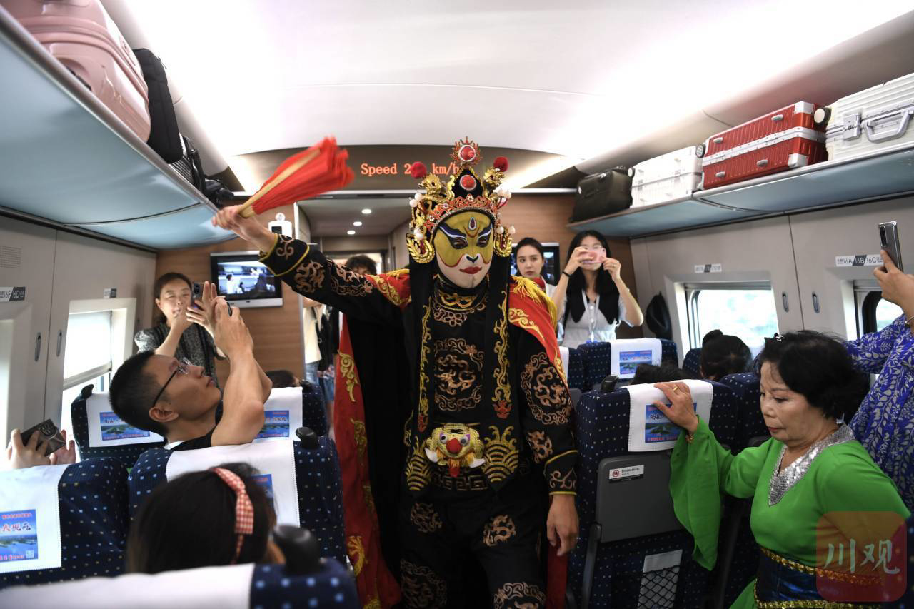 这是成都往返香港首次开行直达高铁。首发列车上,川观新闻联合四川省川剧院、成都市文化馆、乐山大佛景区、兴文石海景区、成都IFS发起“坐上高铁去香港”蓉港高铁首发线下活动,开展川剧变脸表演、歌曲合唱、景区门票赠送等丰富多彩的活动,一路前行一路歌,尽显四川热情。