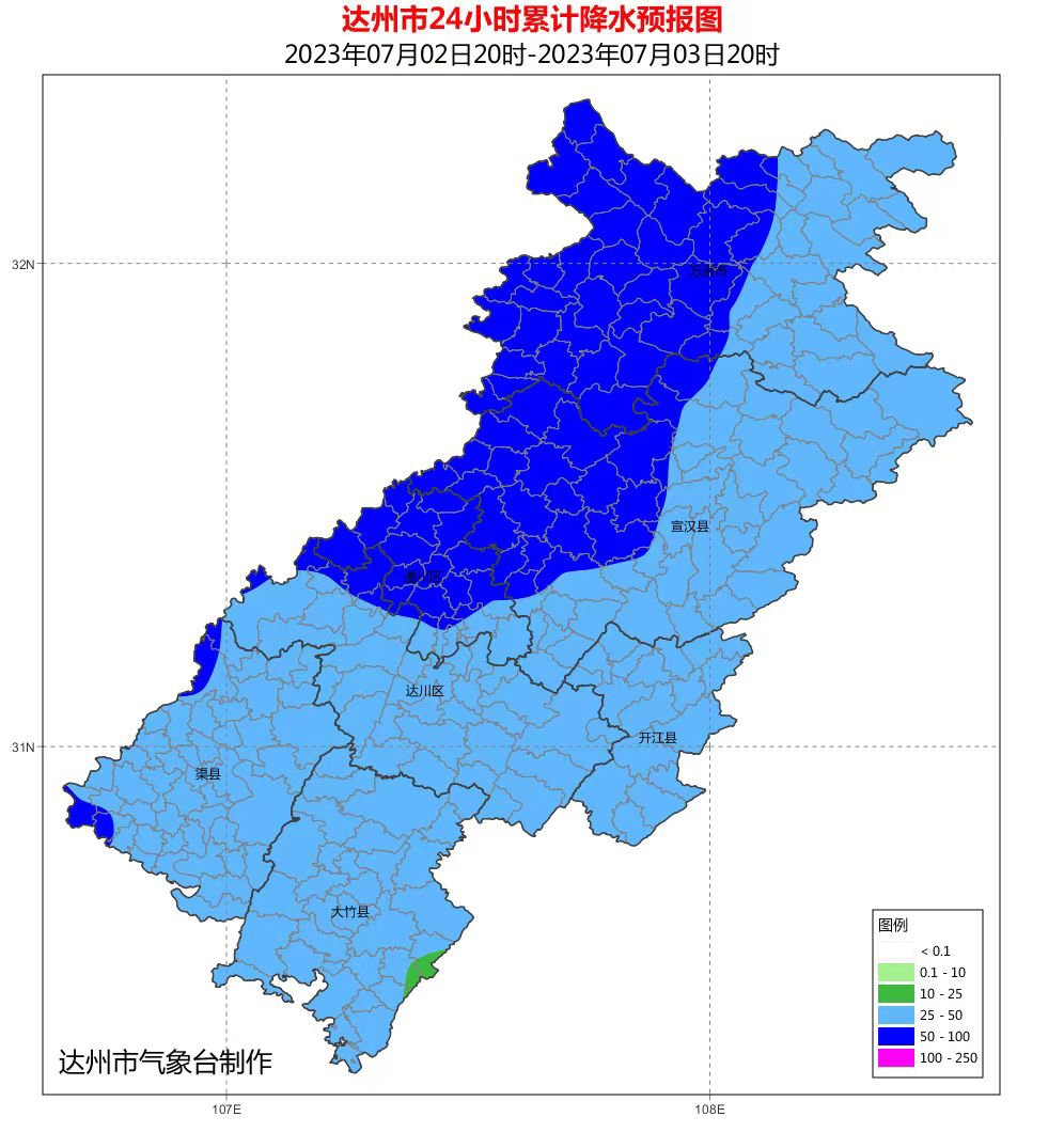 达州市气象台2日下午更新暴雨蓝色预警为暴雨黄色预警,预计2日晚上至3日晚上,全市强降雨还将持续,大部地方暴雨(40~80毫米),其中宣汉中东部、达川区东部、东部经开区以及开江可达大暴雨(120毫米),最大小时雨强30~50毫米,过程中伴有短时强降水、阵性大风、雷电等强对流天气。