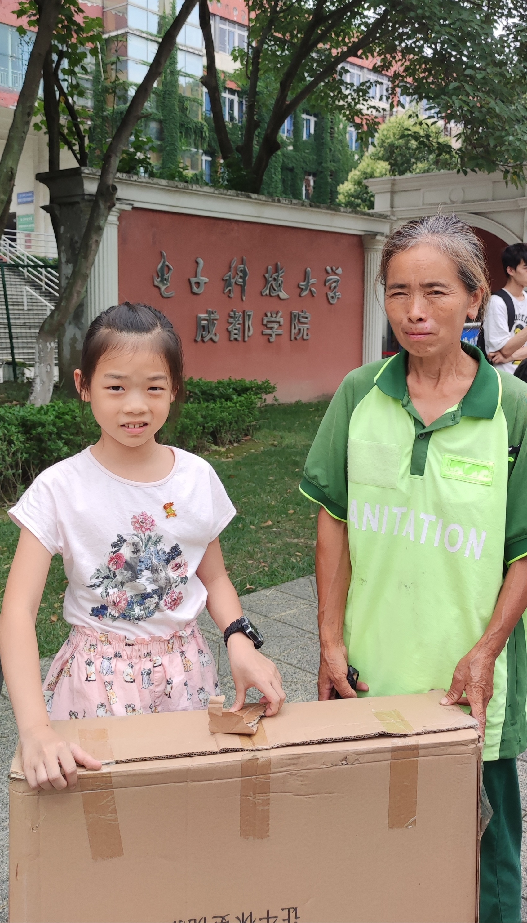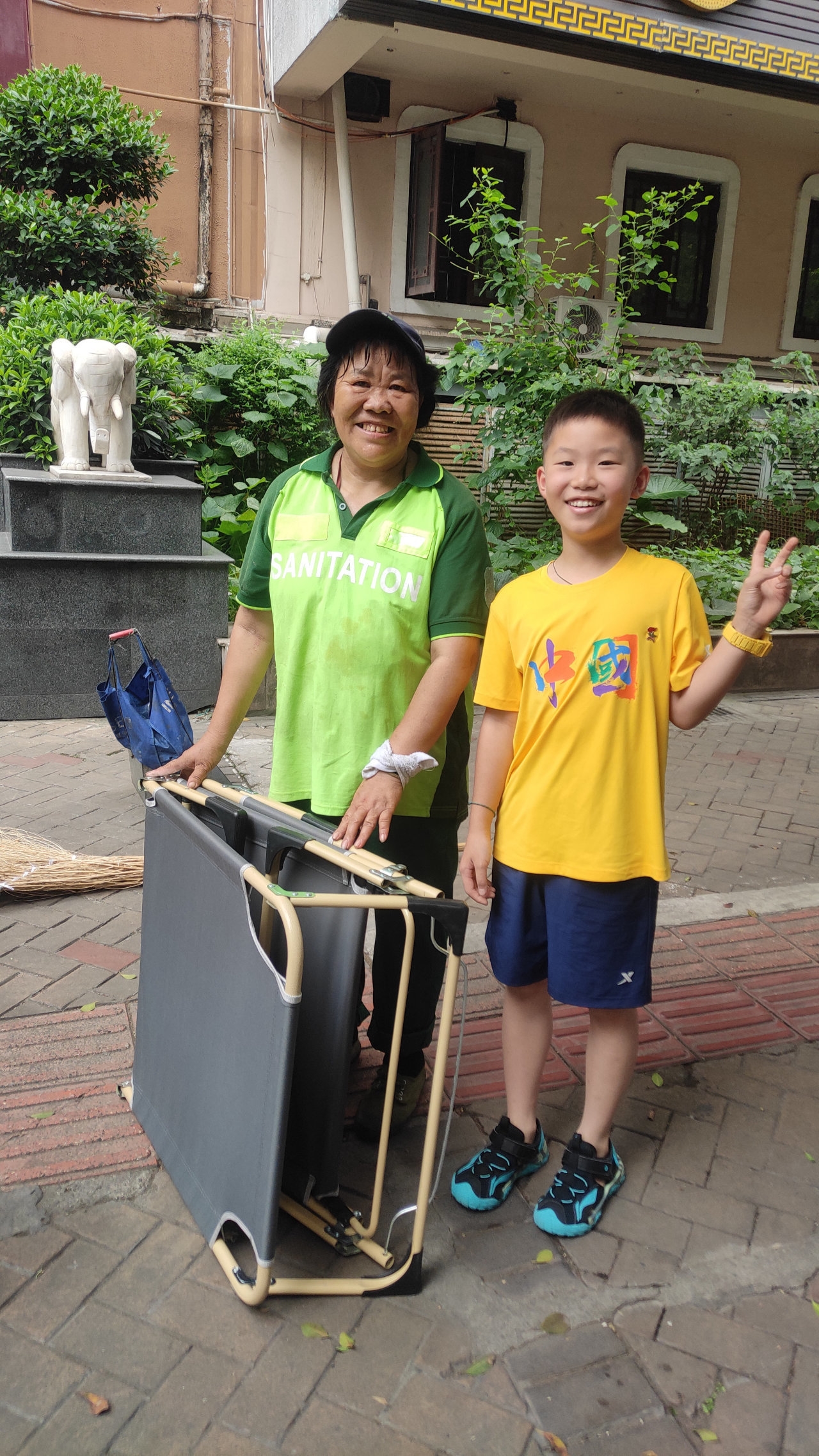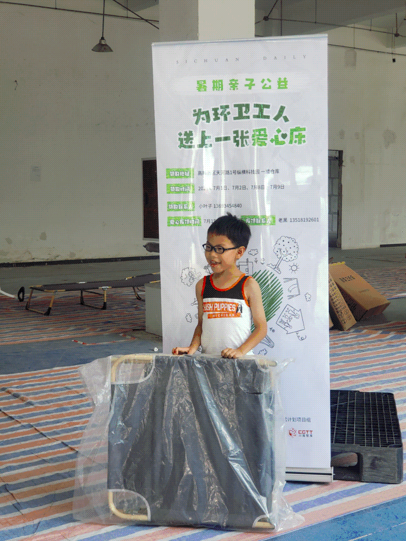 谭祯羽:我们去仓库领取了爱心床后,就开始寻找辛苦的环卫工人。功夫不负有心人,不一会儿,我们就找到一位顶着烈日,辛勤工作的环卫阿姨。我给阿姨说了我们的活动,爸爸妈妈拿出了准备送给她的爱心床。阿姨又惊讶又开心,反复问我们,说:“要给钱吗?”我认真地给阿姨说:“这个是爱心公益活动,不要钱,阿姨你辛苦了!”环卫阿姨这才收下了床,她十分开心。我觉得这个活动非常有意义,我帮助了他人,我也很开心。