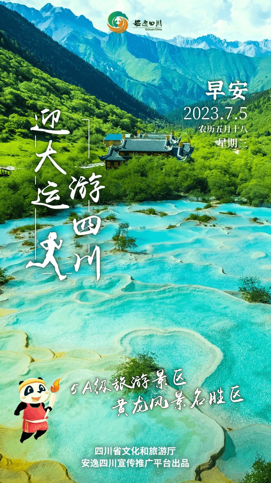 7月5日,星期三。今天安逸四川日历海报“迎大运、游四川”走进黄龙风景名胜区,看地表钙华奇观。