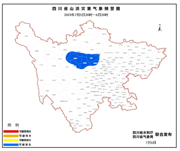 7月5日17时,四川省水利厅、四川省气象局联合发布山洪灾害蓝色预警。