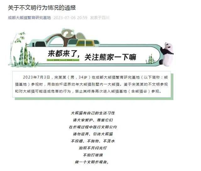 2023年7月3日,宋某某(男,34岁)在成都大熊猫繁育研究基地(以下简称:熊猫基地)参观时,用自拍杆逗弄幼年大熊猫别墅内一大熊猫。鉴于宋某某的不文明参观和对大熊猫可能造成危害的行为,禁止其终身再次进入熊猫基地(含熊猫谷)参观。大熊猫有自己的生活习性请大家爱护、尊重它们在参观过程中践行文明公约请勿逗弄、引诱大熊猫。不投喂、不抛物、不泼水、拍照不开闪光灯、不拍打玻璃。做一个文明参观者。