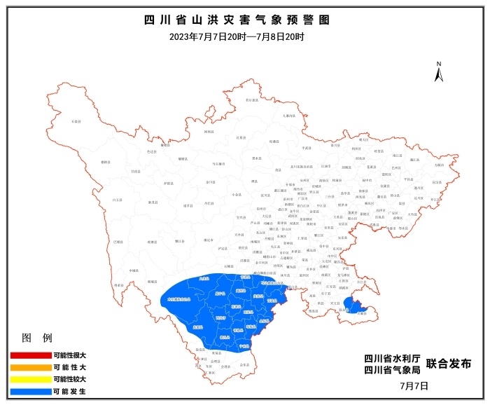 今日,四川省水利厅联合四川省气象局发布山洪灾害蓝色预警,2023年7月7日20时至8日20时,凉山州⻄昌、晃宁、喜德、越⻄、昭觉、美姑、金阳、雷波、布拖、普格、宁南、德昌、盐源、木里、甘洛、会理,攀枝花市盐边、米易,甘孜州九⻰,雅安市石棉,乐山市⻢边、峨边,宜宾市屏山,泸州市叙永、古蔺等25个县(市、区)可能发生山洪灾害。