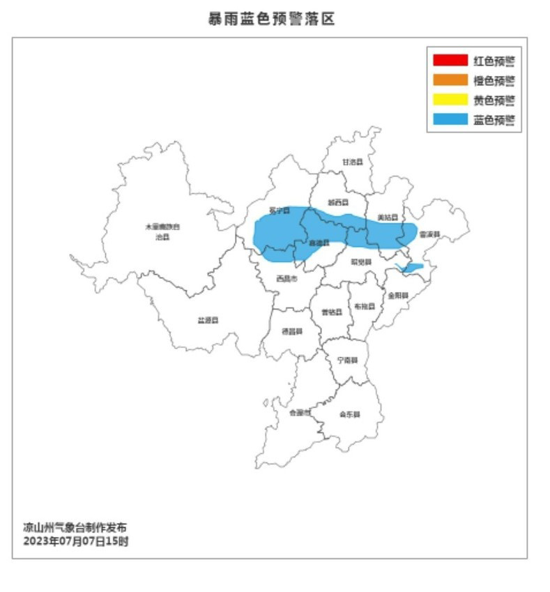 7月7日15时46分,凉山州气象台发布暴雨蓝色预警:预计7日傍晚到8日白天,西昌市、冕宁县、越西县、喜德县、美姑县、昭觉县、雷波县多云转阴有大雨,部分乡镇有暴雨,个别乡镇有大暴雨;州内其余县市多云转阴有中雨,个别乡镇有大到暴雨。降雨时,局地可能伴有雷电、阵性大风、冰雹等强对流天气。请注意防范强降雨天气可能带来的不利影响。