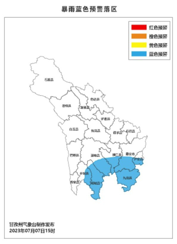 7月7日15时22分,甘孜州气象台发布暴雨蓝色预警:受高空切变线影响,预计7日20时至8日20时,稻城、九龙及乡城东部、康定、泸定、雅江、理塘4县南部部分乡镇有暴雨,九龙境内个别乡镇有大暴雨。请各级各相关部门加强防范山洪、泥石流、滑坡等地质灾害,强化监测、巡查、值守工作,做好主动预防、提前避险工作。