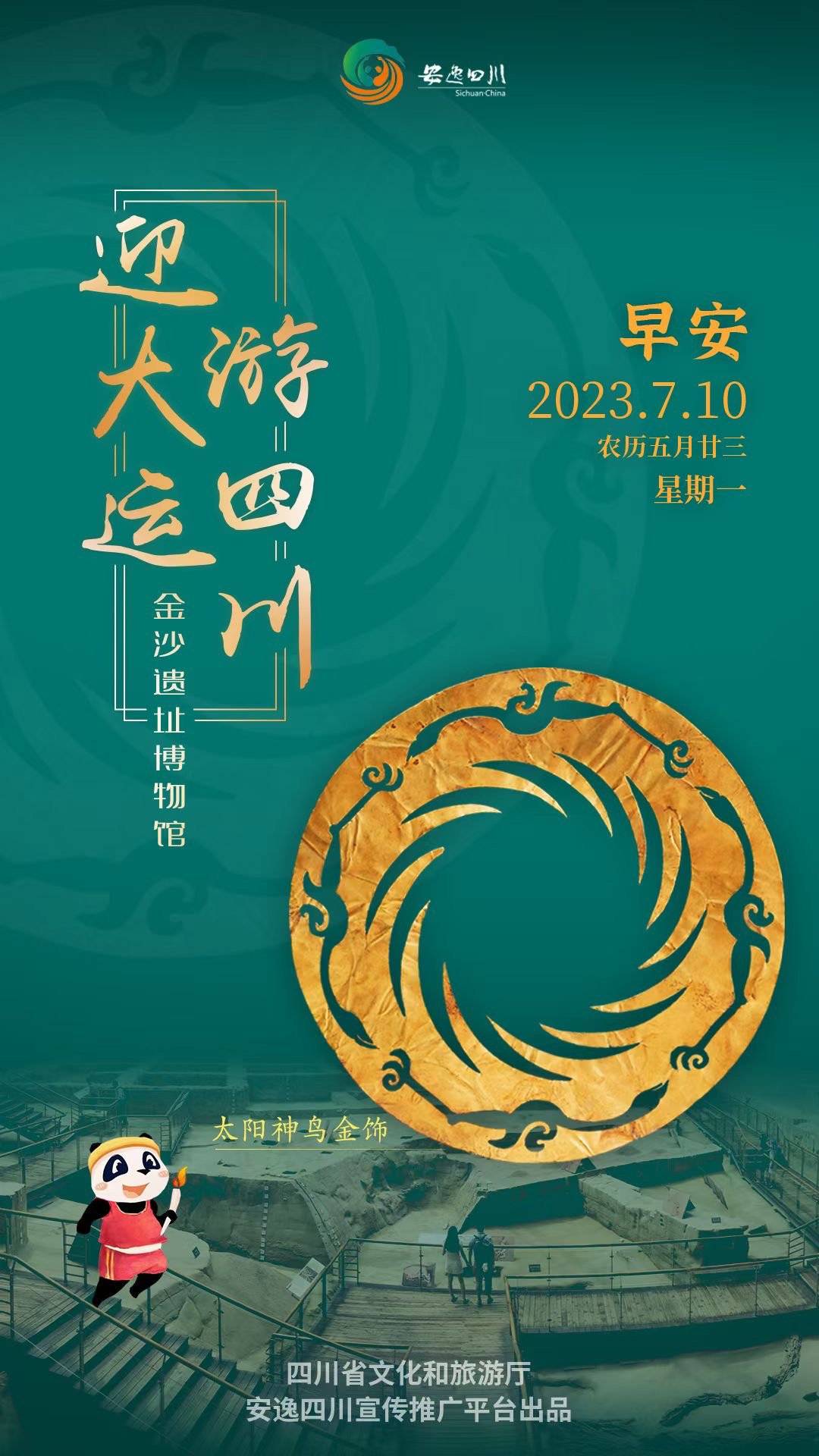 7月10日,星期一。今日安逸四川日历海报“迎大运游四川”之旅走进金沙遗址博物馆,在太阳神鸟金饰中看见古蜀之光。