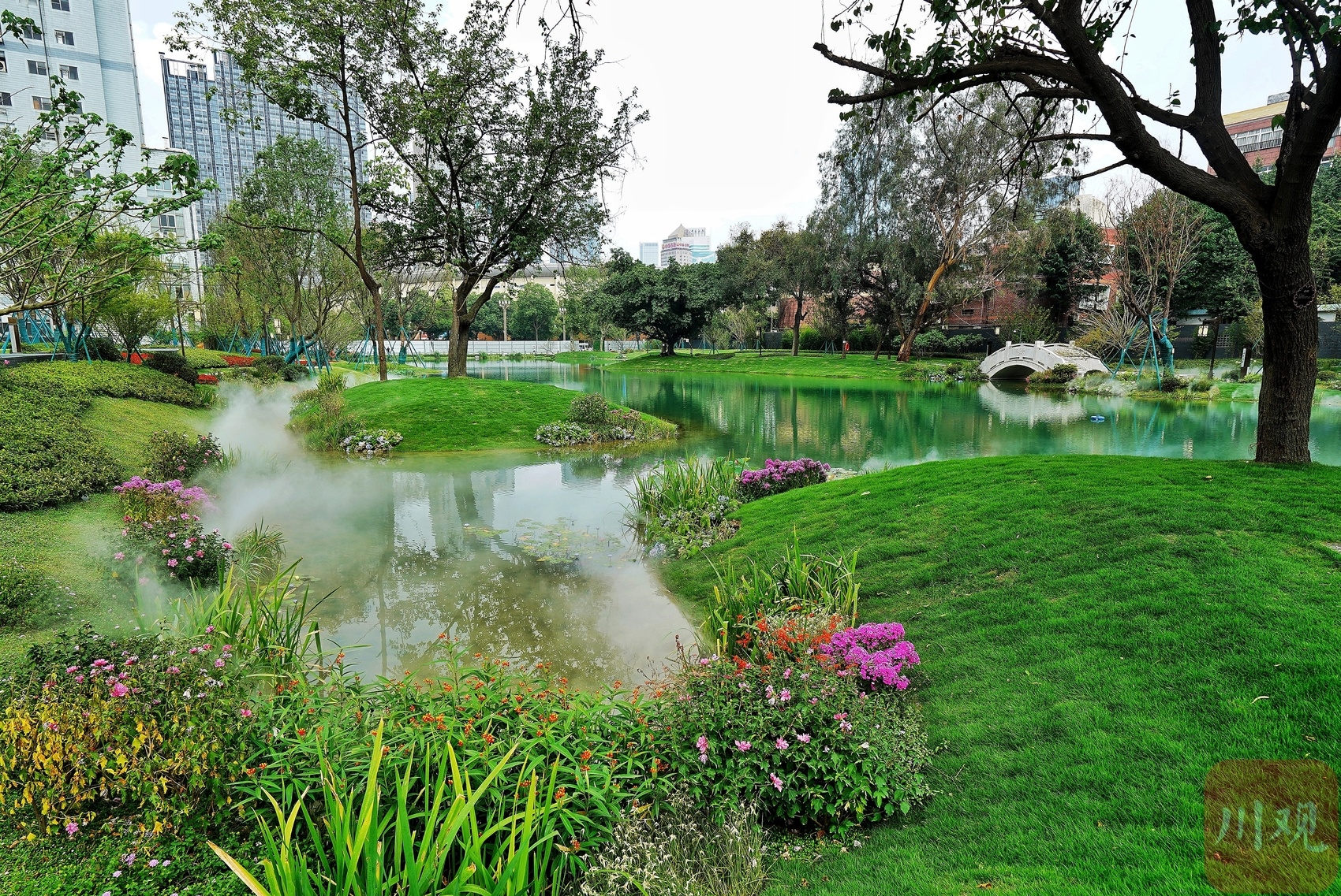 余晖洒满摩诃池,池边花开满枝头,淡淡的花香在池边缭绕。史料记载,摩诃池是由隋蜀王杨秀开凿,为修筑蜀王府和子城,命人直接在城中取土,土坑渐积雨水形成一个大池。当西域僧人来到成都,见如此水面,称之“摩诃毗罗”,摩诃在梵语中意为大,毗罗为龙,表明池中大且有龙,故名为摩诃池。