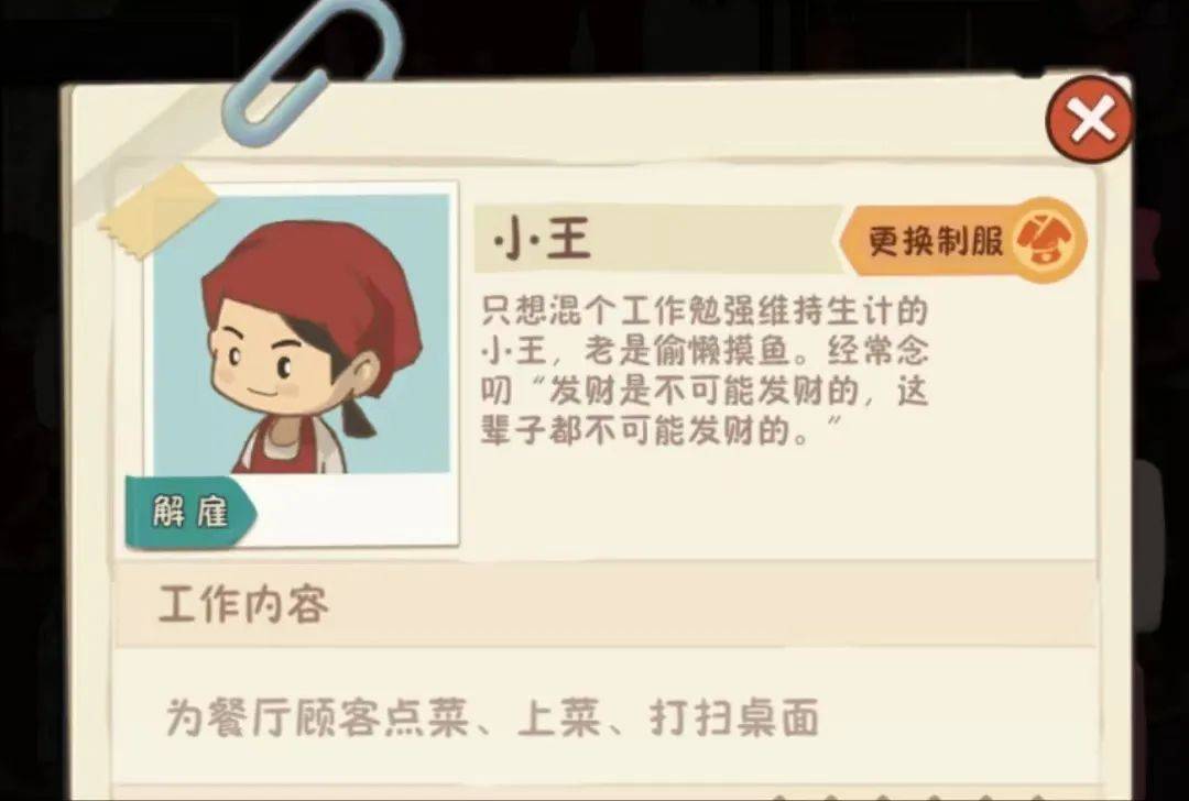 你接待的顾客也并非没有灵魂的纸片人,他们在餐桌上聊着应酬、升学这些富有中国生活气息的话题。游戏中玩家雇佣的员工同样如此,每个员工都有着对应的背景故事,性格与台词也各不相同。