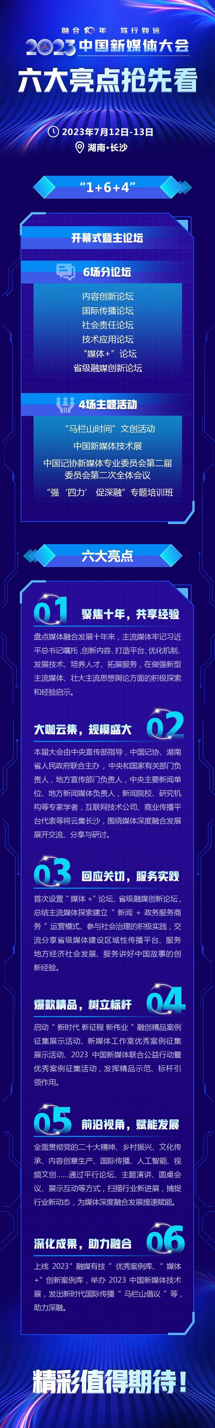 最新的智媒技术,精彩的媒体产品案例分享……本届大会包括1场开幕式暨主论坛,内容创新论坛、国际传播论坛、社会责任论坛、技术应用论坛、“媒体+”论坛、省级融媒创新论坛等6场平行论坛,“马栏山时间”文创活动、中国新媒体技术展等4场主题活动。