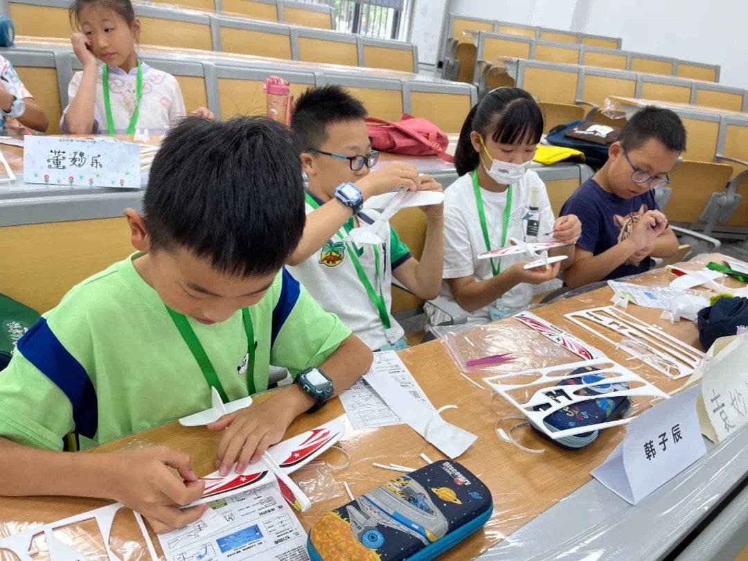 在电子科技大学清水河校区,小学学龄的教职工子女正在老师的指导下制作动力飞机。电子科技大学 供图