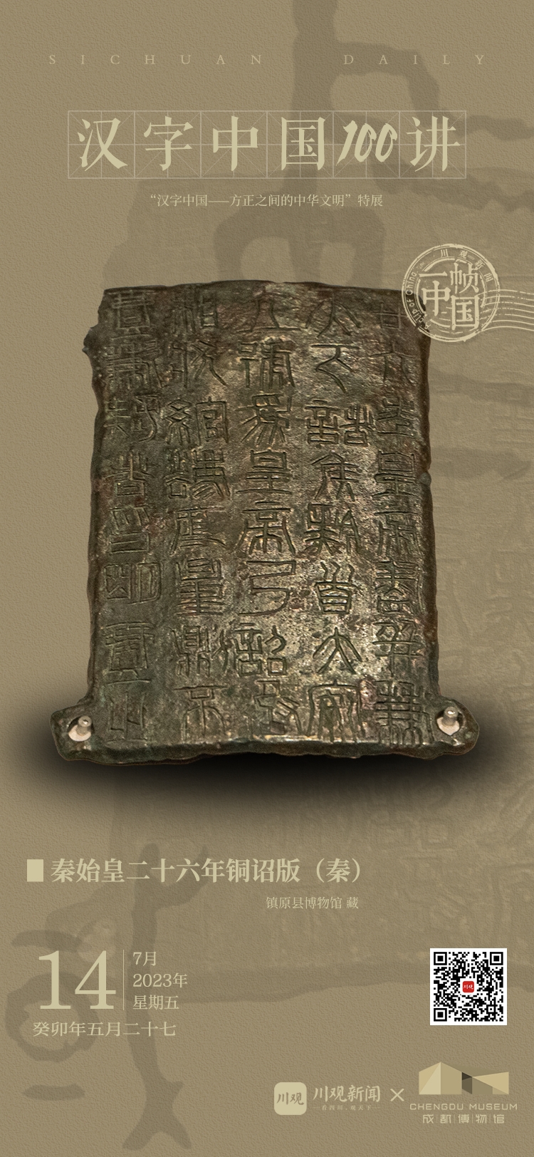 “秦始皇二十六年铜诏版”铸造于秦始皇二十六年(公元前221年)。正面以秦篆阴刻40字,释文:“廿六年,皇帝尽并兼天下诸侯,黔首大安,立号为皇帝,乃诏丞相状、绾,法度量则不壹,歉疑者,皆明壹之。”其主要记载了始皇统一天下,下诏要求全国推行统一度量衡制度。