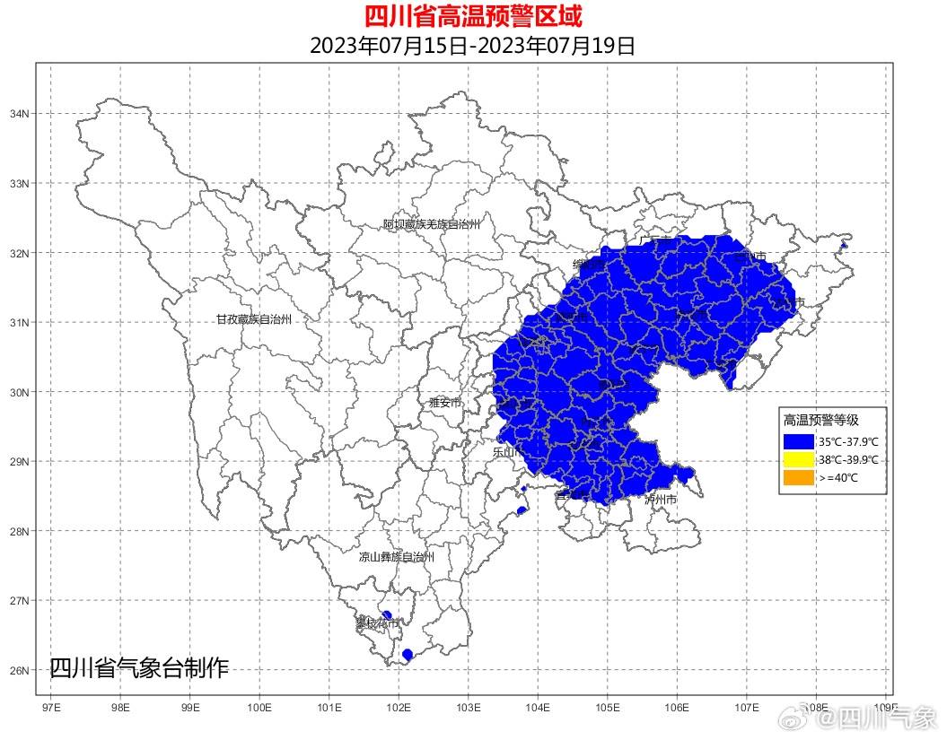 四川省气象台14日16时发布高温蓝色预警:15日到19日,广安、南充、遂宁、资阳、内江、自贡6市和广元、绵阳、德阳、成都、眉山、乐山6市东部,巴中、达州2市南部,宜宾、泸州2市北部的部分地方日最高气温可达35℃或以上,局部地方将超过38℃。