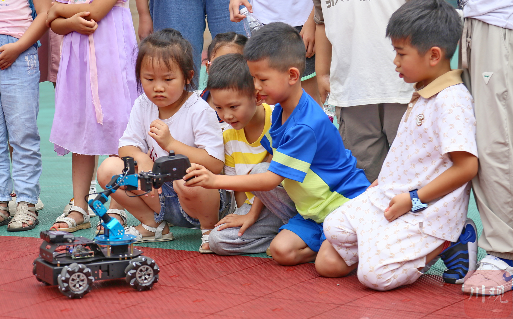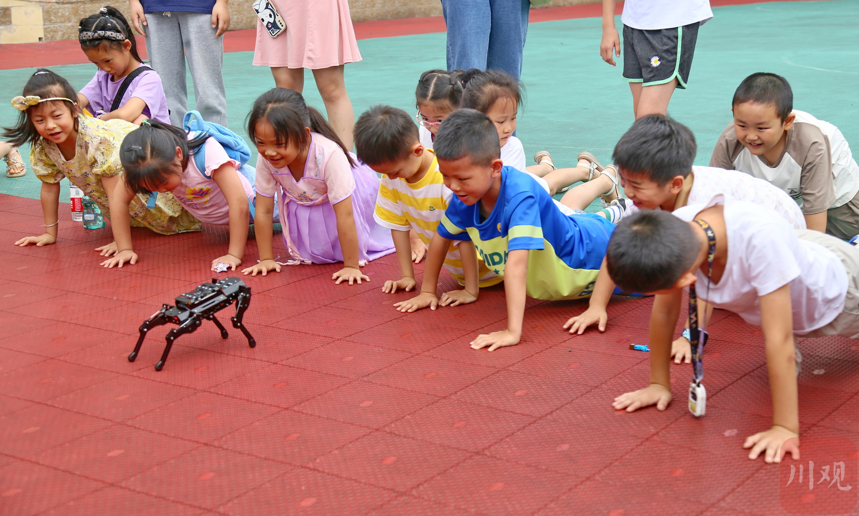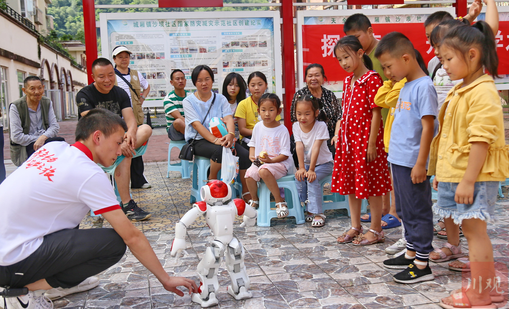 7月14日, 雅安市天全县城厢镇沙坝社区的小朋友观看“四足机器狗”演示。