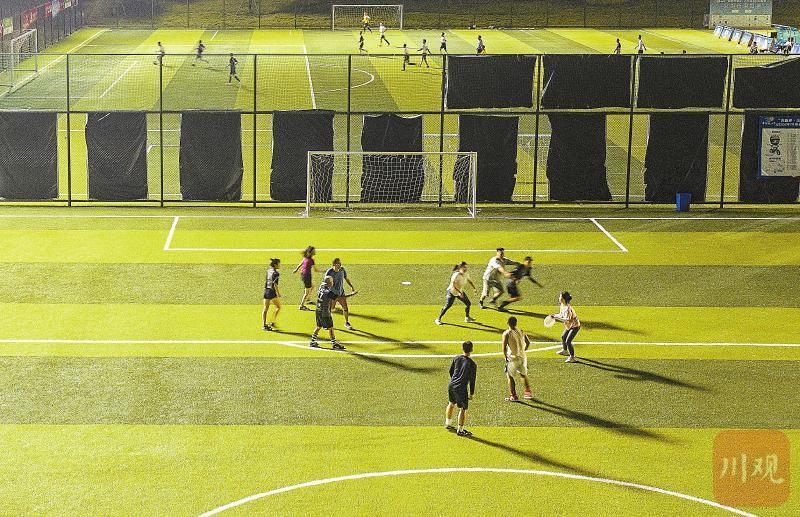 6月8日,成都,一群年轻人在灯火通明的夜间足球场追逐“极限飞盘”,享受大汗淋漓的畅快。