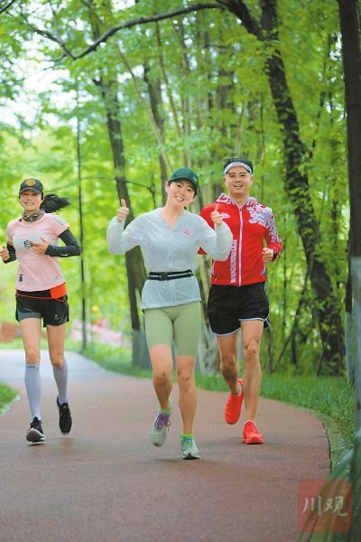 7月15日,成都崇州市的周女士(中)在跑步。她坚持每个周末在桤木河湿地公园进行越野跑,享受运动乐趣。