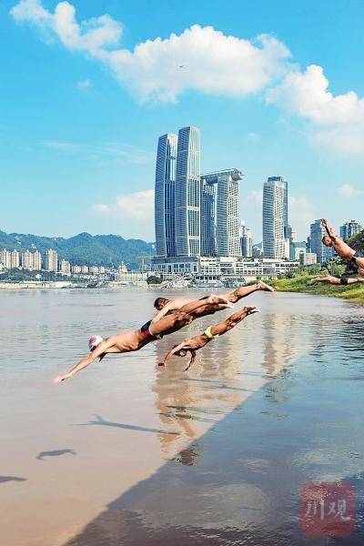 与此同时,在重庆长江边,一群游泳爱好者在江畔跳水度夏。他们一个接一个跃入江水,在长江中劈波斩浪,一边锻炼身体,一边欣赏着江波浩渺,往往要游上数百米方能尽兴。