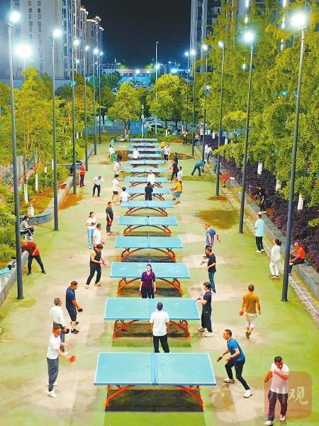 6月18日晚,重庆市梁平区全民健身中心灯火通明,市民们在乒乓球台前挥舞着球拍,闪转腾挪。