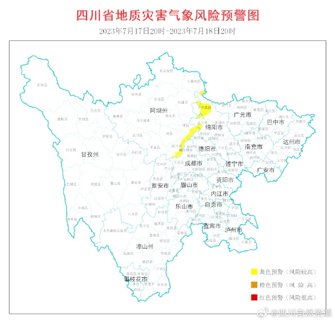 根据四川省地质环境条件,结合四川省气象台天气预报情况,7月17日20时至7月18日20时,全省地质灾害气象风险预警结果如下: