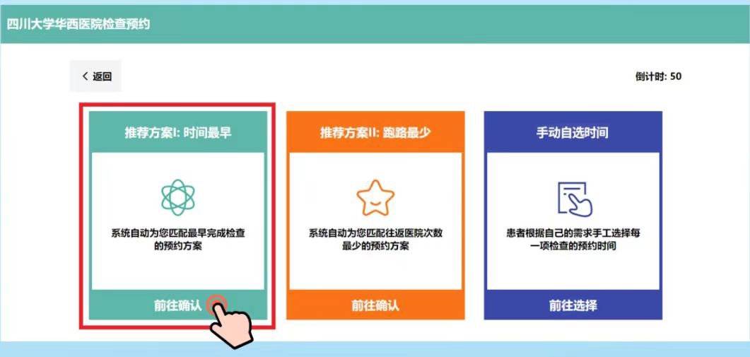 预约系统将为患者提供“时间最早”“跑路最少”“手动自选时间”三个方案。“时间最早”方案将为患者自动分配最靠前的检查时间,例如,系统为患者预约彩超在第二日上午、胸部CT第二日下午、胃肠镜第五日,这对于不介意多跑医院、住在医院附近或者时间相对充裕的患者比较实用;“跑路最少”方案将患者所有的检查集中在1天内或2至3天内完成,对上班族或者时间有限的患者比较友好;“手动自选时间”方案中,患者对于系统自动安排的时间可进行手动选择、灵活调整。患者在检查医嘱缴费完毕后,使用手机或者自助机“一键式”就能搞定检查时间,不用楼上楼下来回多个窗口预约。