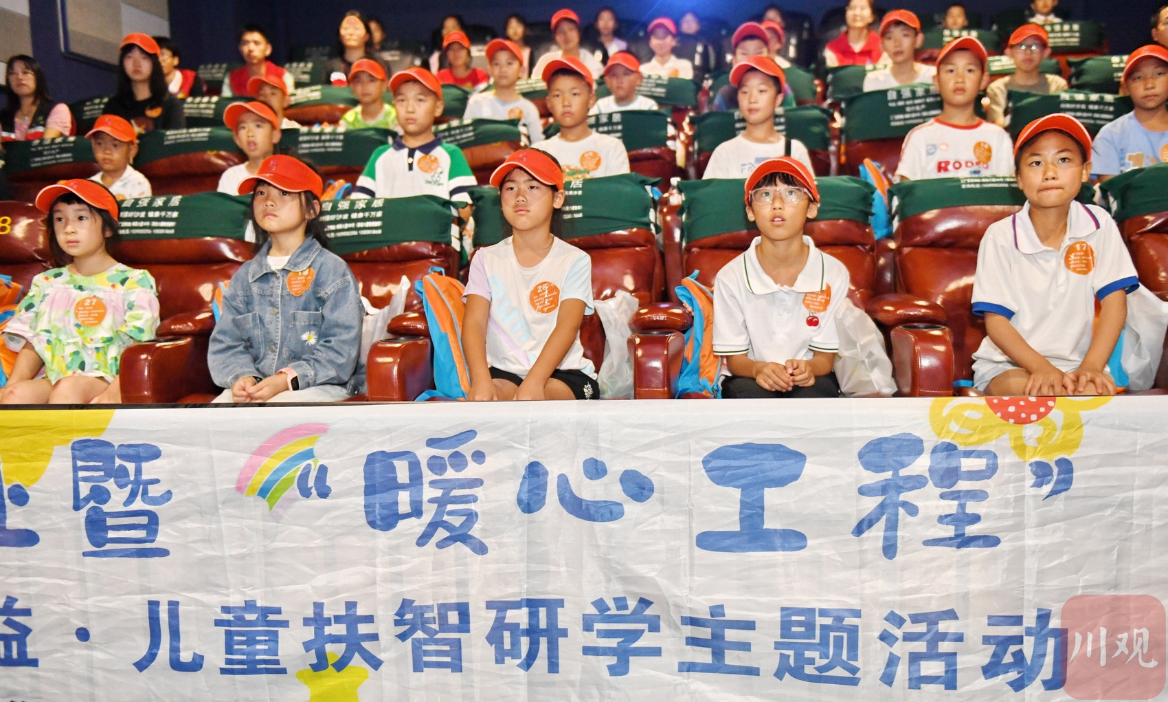 7月18日晚,“汶暖公益·儿童扶智”研学行开营仪式在成都市大邑县举行,图为孩子们在一起看励志电影。