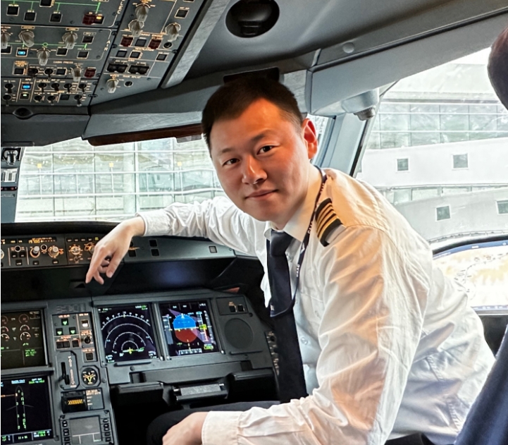 卢星扬在飞机驾驶室内。
