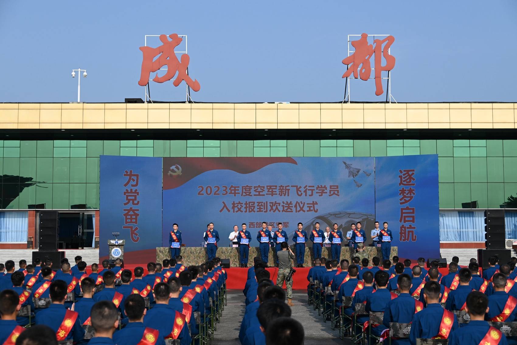 7月19日,空军在成都某军用机场举行新飞行学员入校报到欢送仪式,来自四川、云南、新疆等西部10省(自治区、直辖市)的新飞行学员从这里乘坐运-20到空军航空大学报到。